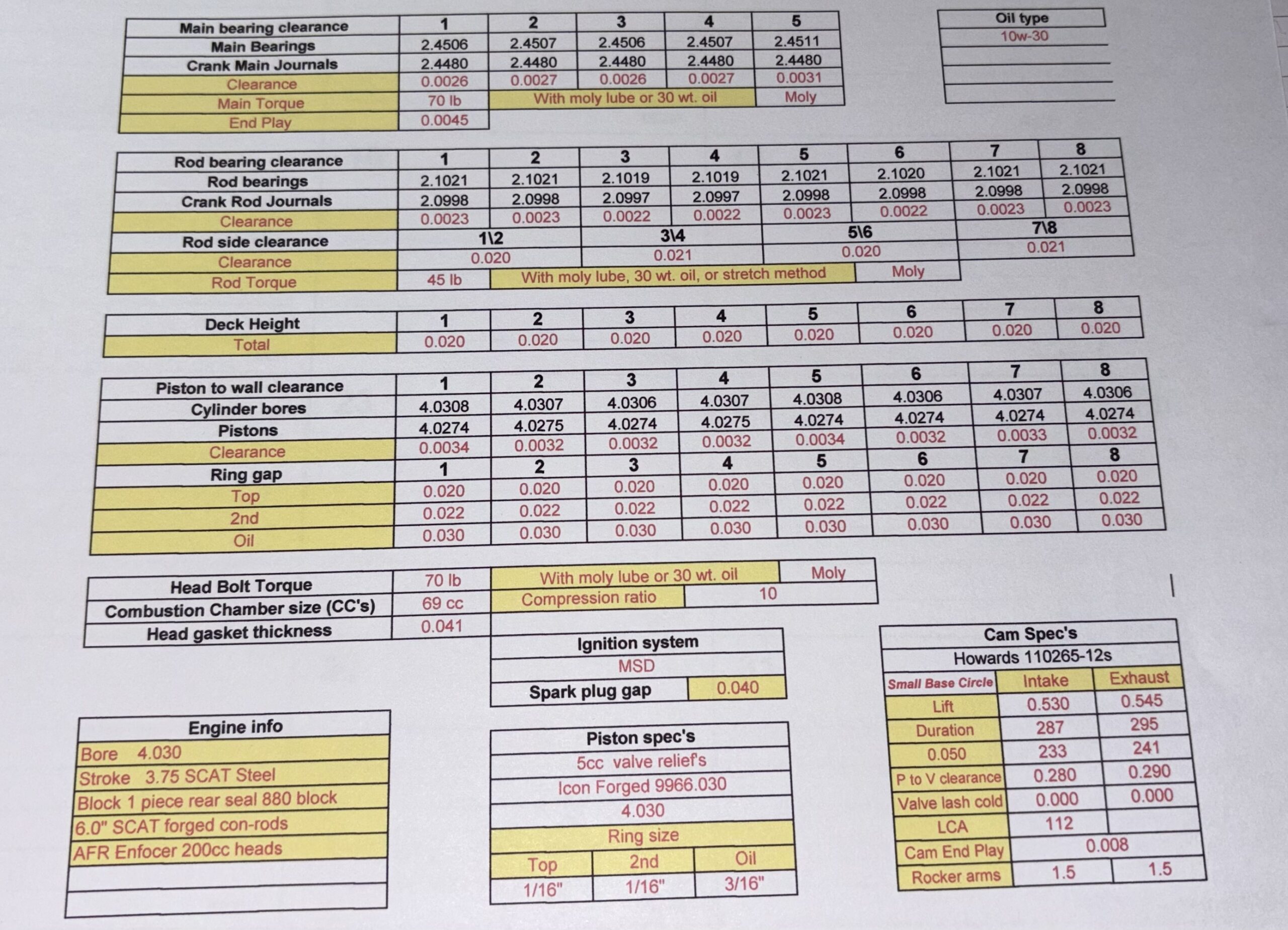 The sheet with all the engines clearances and vital information
