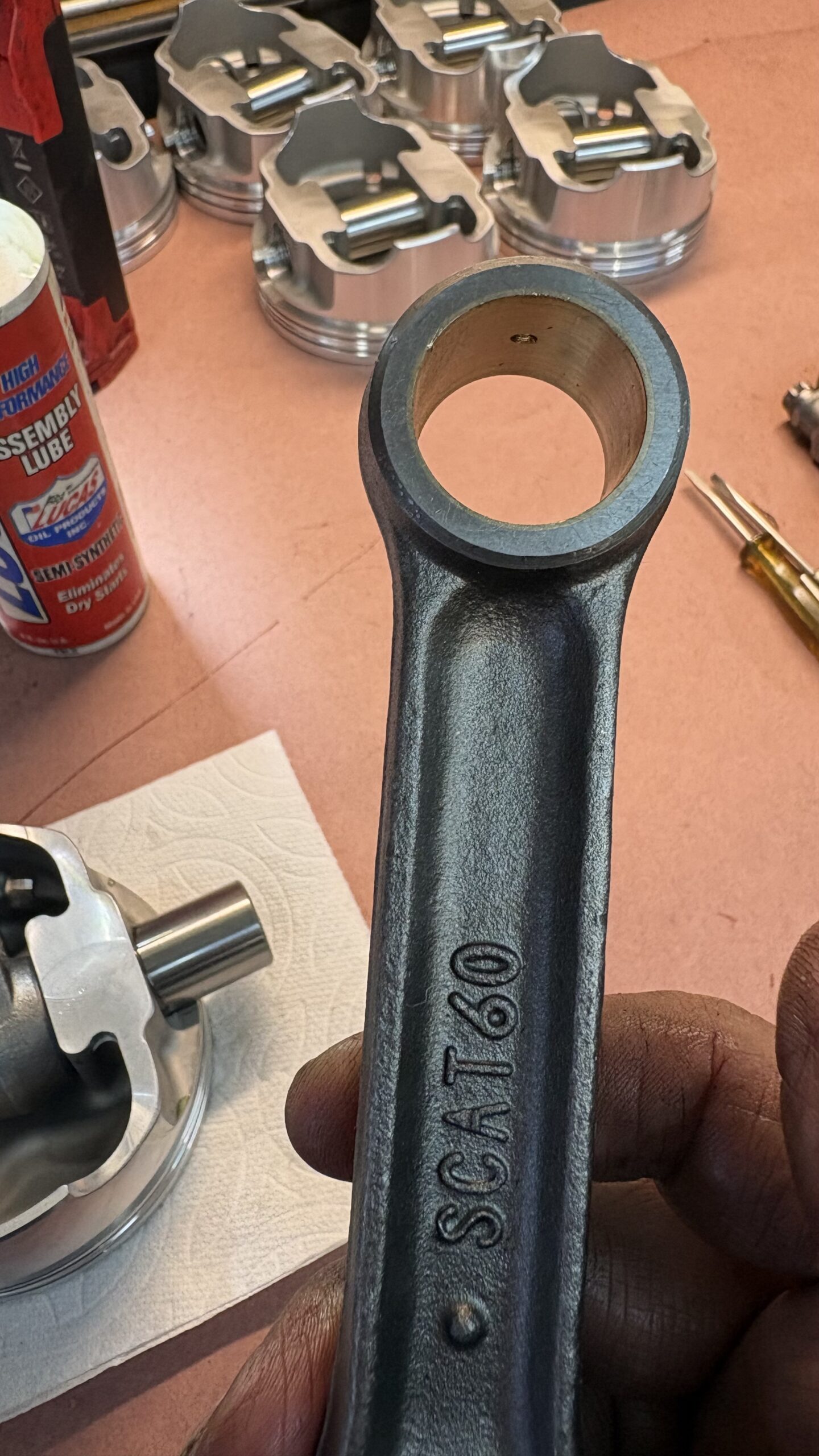 After the pistons and rods are torqued down the rod side clearance is checked (.023″ – .024″)