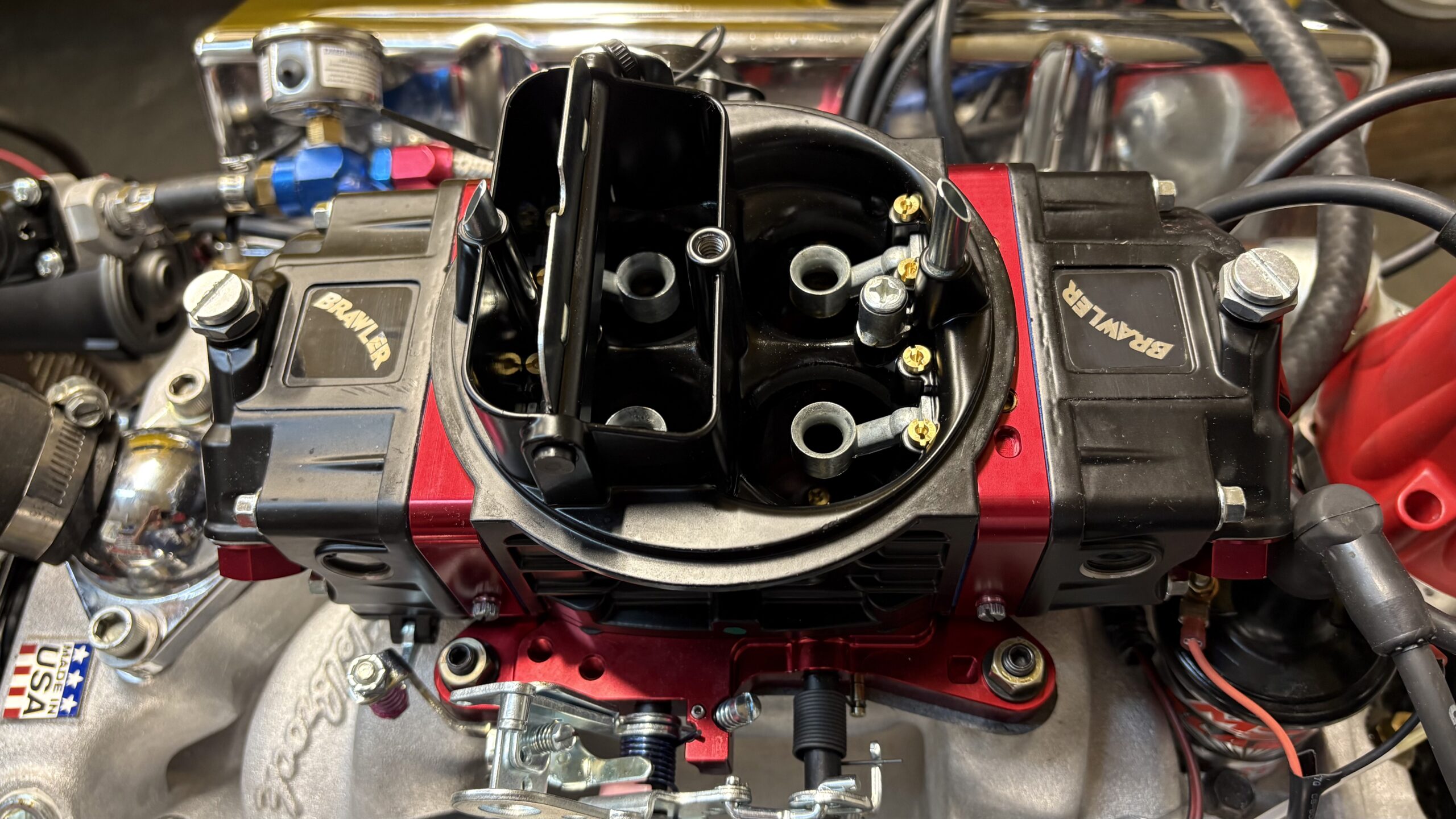 Brawler 750 cfm double pumper carb, Edelbrock RPM performer air-gap intake manifold, AFR 200 cc Enforcer cylinder heads, MSD distributor and 6AL box