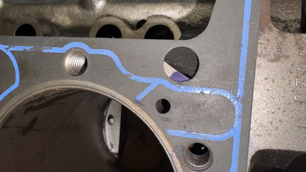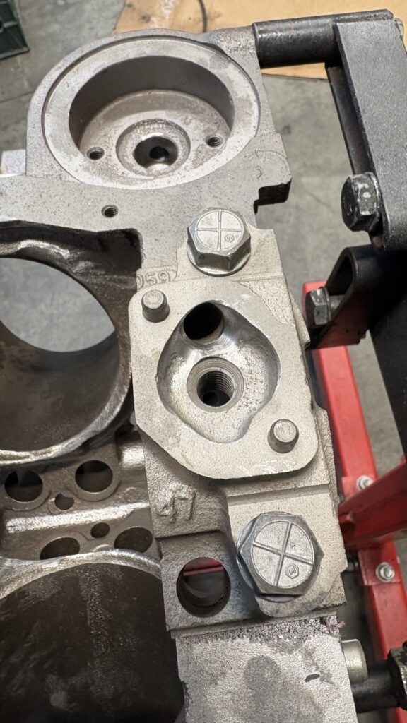 The block was cleaned, all the bolt holes chased and chamfered to ensure the heads would sit flush on the deck. The oil galley holes behind the timing chain were tapped and threaded pipe plugs were installed.