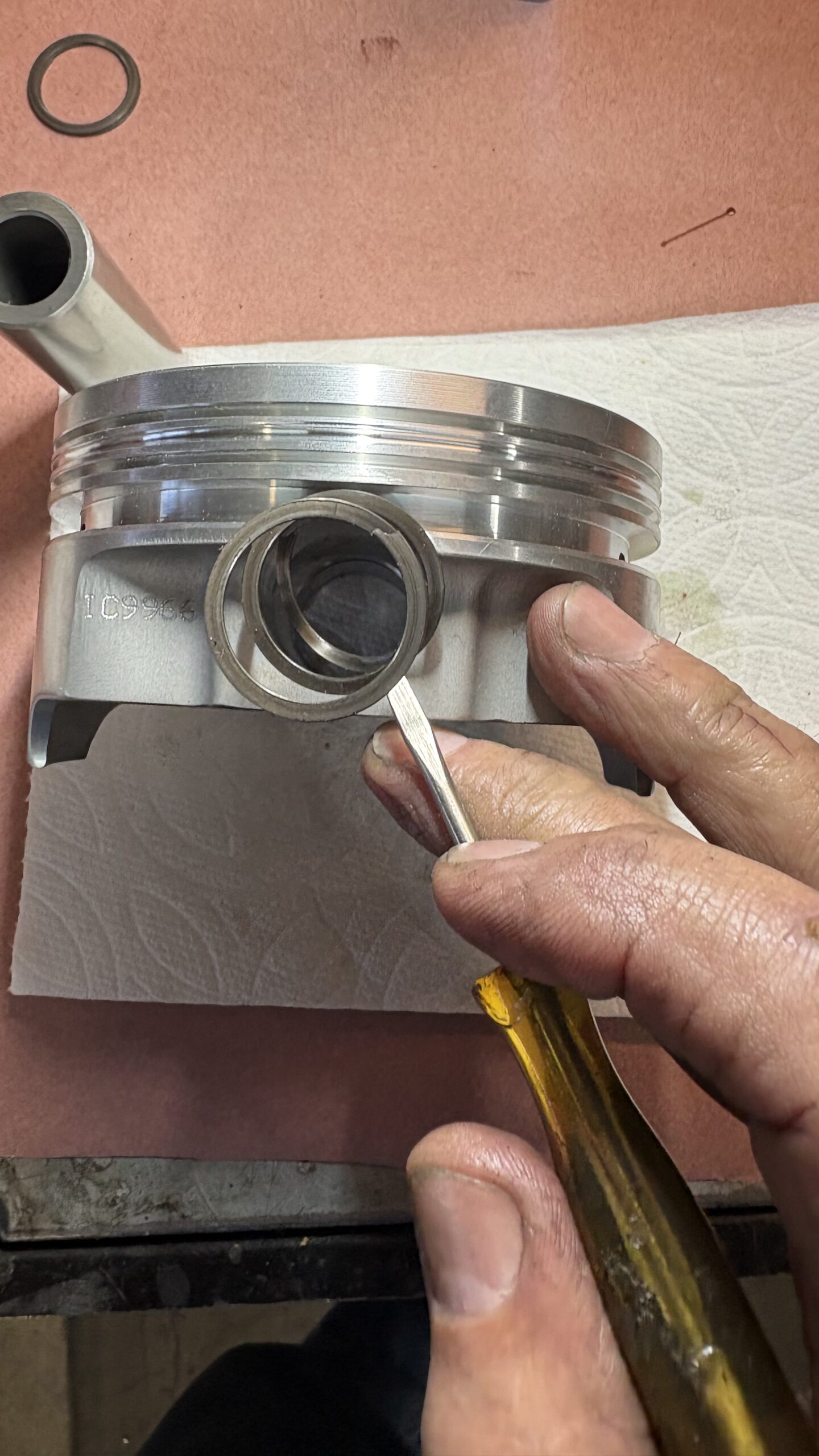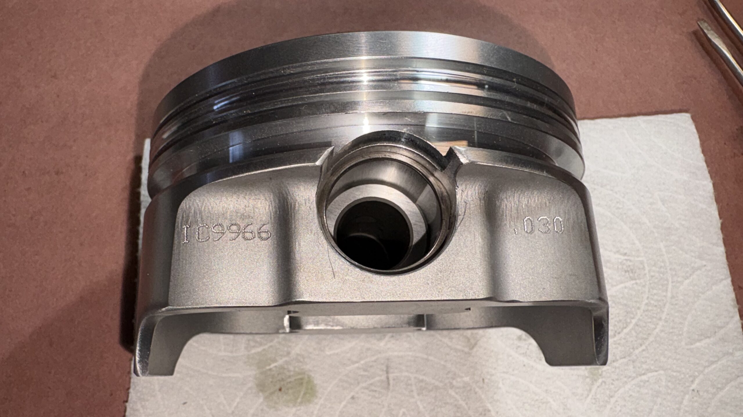 Next I checked the piston to cylinder wall clearance;  4.026″ on all the pistons, 4.0302″-4.0303″ on the cylinder walls giving us a little over .004″ piston to cylinder wall clearance. All the piston rings were hand filed to top -.019″, second – .023″ , oil ring – .015″ .