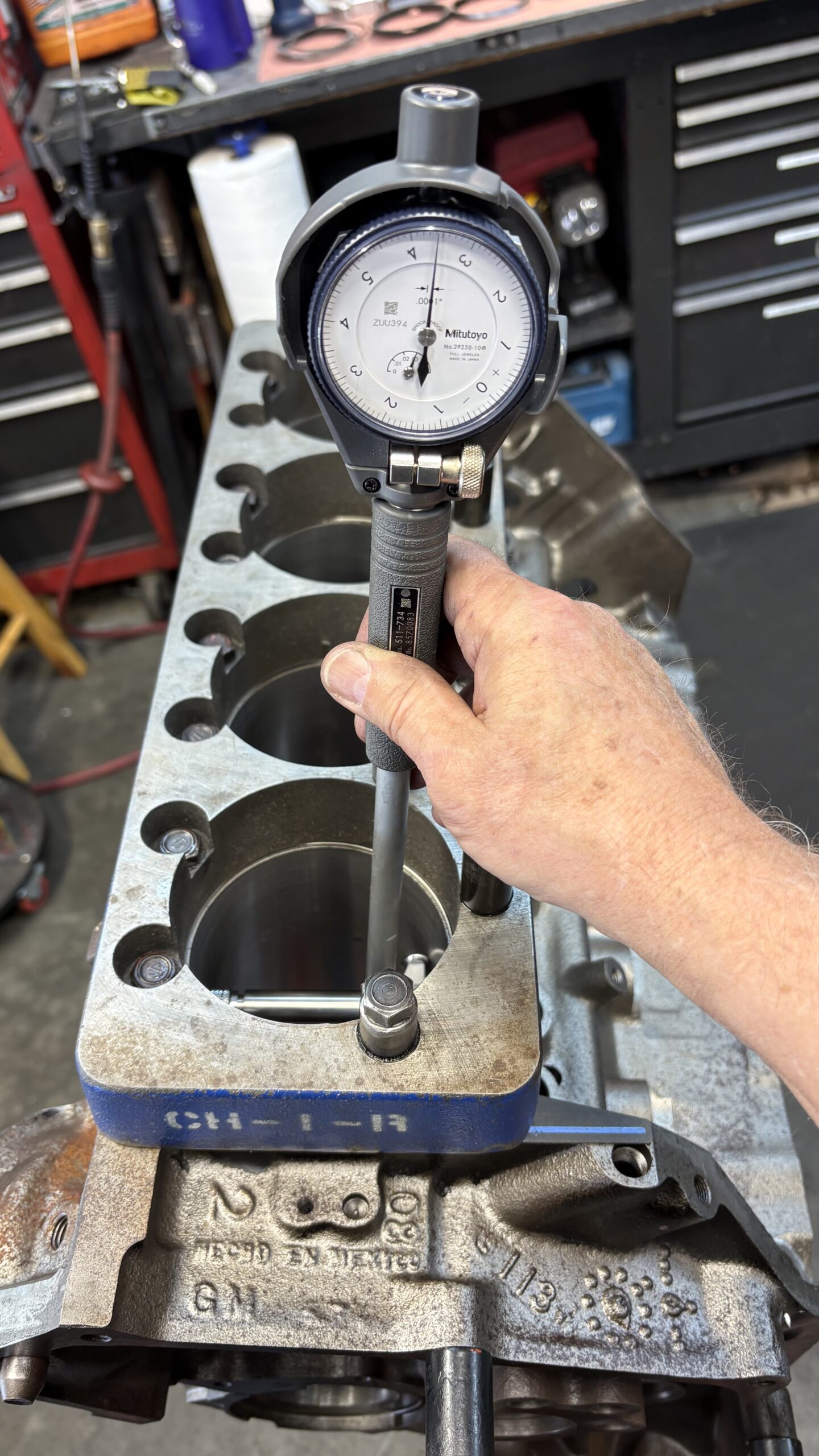 I started with the main journals.  After having the crank polished I got 2.477″ on the main caps and 2.48″ on the crank giving us a solid .003″ clearance. I did the same with the connecting rods; 2.097″ on the rod ends and 2.100″ on the crank giving us the same .003″ clearance.