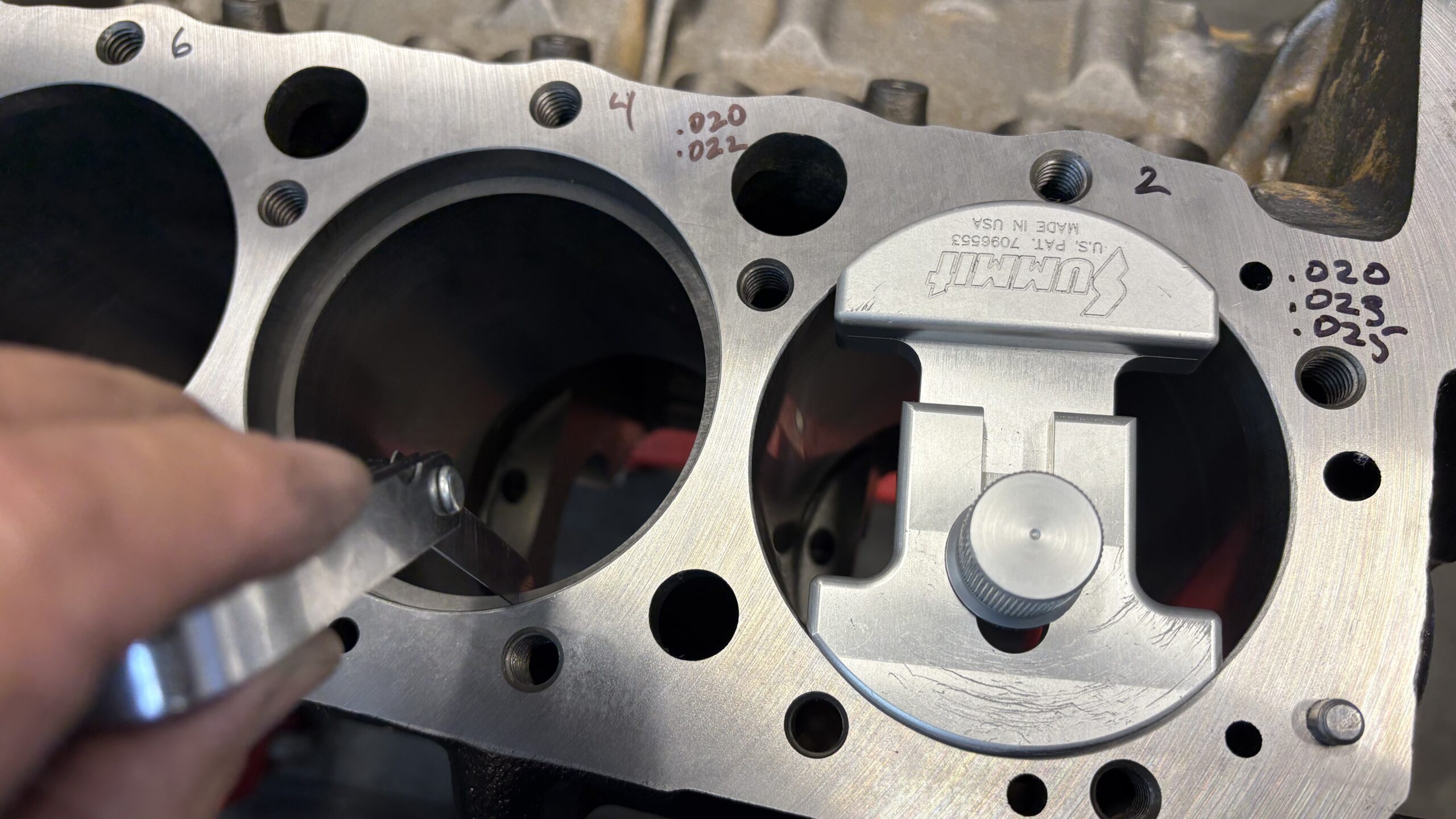 Double checking the deck height we got -.005″ out of the hole.  This set us up with a quench of .036″ which helps reduce the chance of detonation on 91 octane fuel.