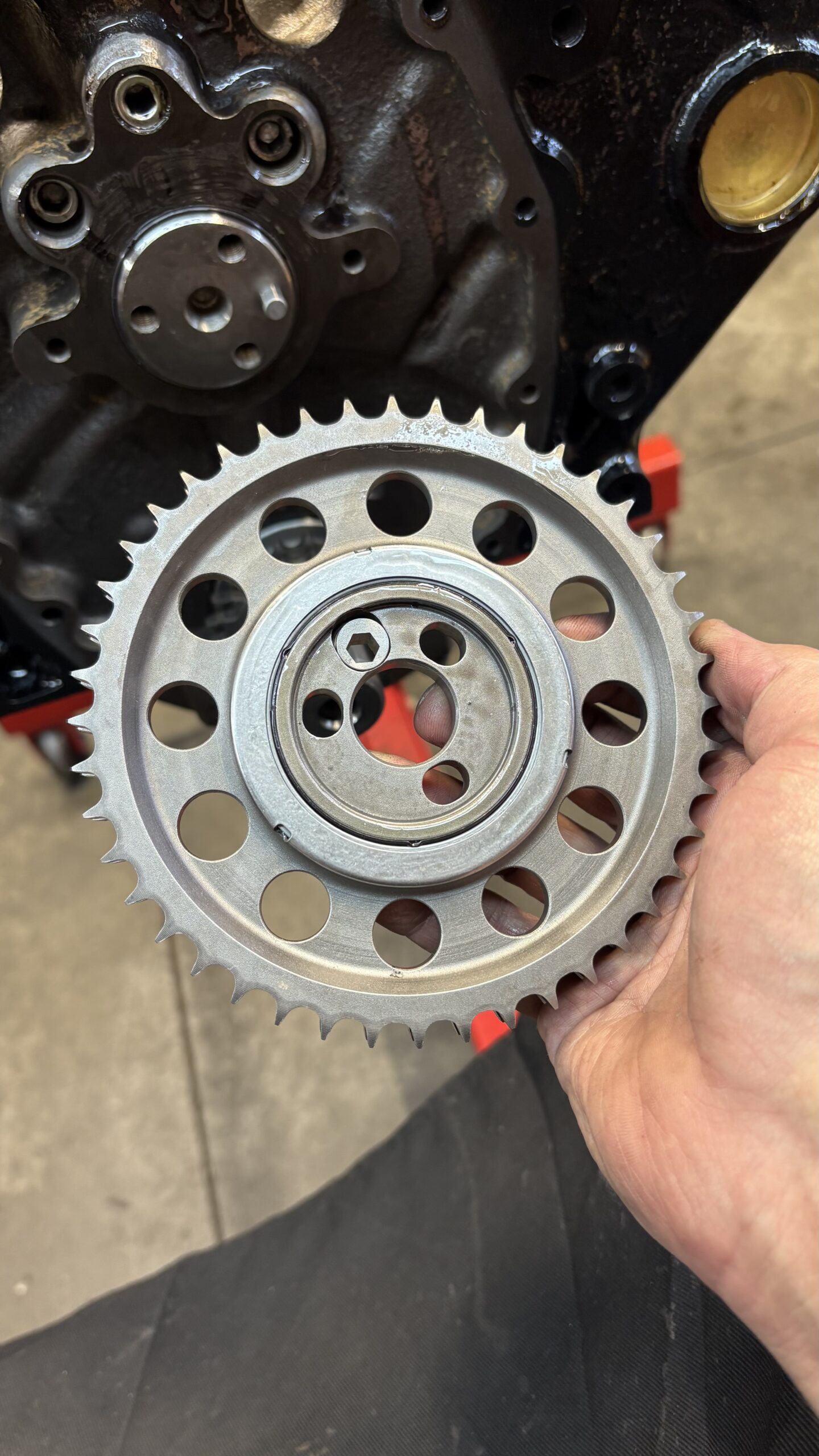 I installed a timing chain with a Torrington bearing the Gen V Big Block timing chain covers are hard to come so I modified the existing cover but I welded on an additional plate to stiffen it up, the camshaft end play is (.005″)